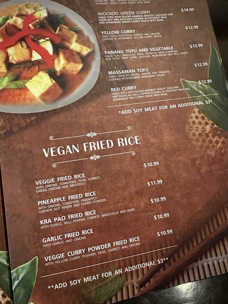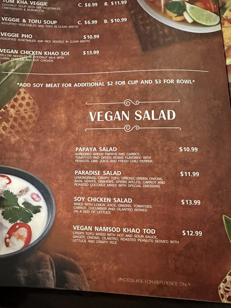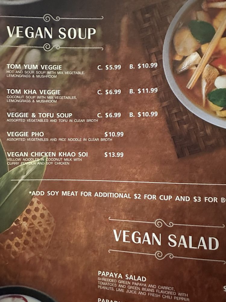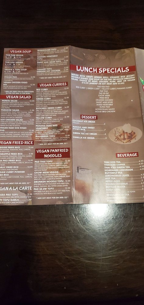 Thailicious Authentic Thai & Vegan offers a diverse selection of vegan Thai dishes with a wide range of options suitable for various dietary preferences. Located in Henderson, NV, the restaurant provides a casual and trendy atmosphere with convenient amenities like wheelchair accessibility and free Wi-Fi. The menu features starters like Chicken Satay and Spring Rolls, along with flavorful soups like Tom Yum Kai and Tom Yum Kung. Salad options include Papaya Salad and Laos Style Papaya Salad, showcasing the bold flavors of Thai cuisine. With offerings for lunch, dinner, and dessert, Thailicious is a great spot for groups and families alike. The inclusion of happy hour specials, outdoor seating, and BYO container policy adds to the charm of this Asian and women-owned establishment. Overall, Thailicious Authentic Thai & Vegan promises a delicious and inclusive dining experience for all.
